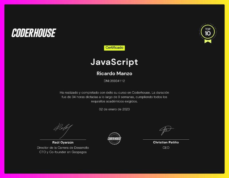 Durante junio-diciembre de 2022 estudie Desarrollo Front end en Coderhouse logrando entrar en el top 10 en el curso de React.js.